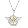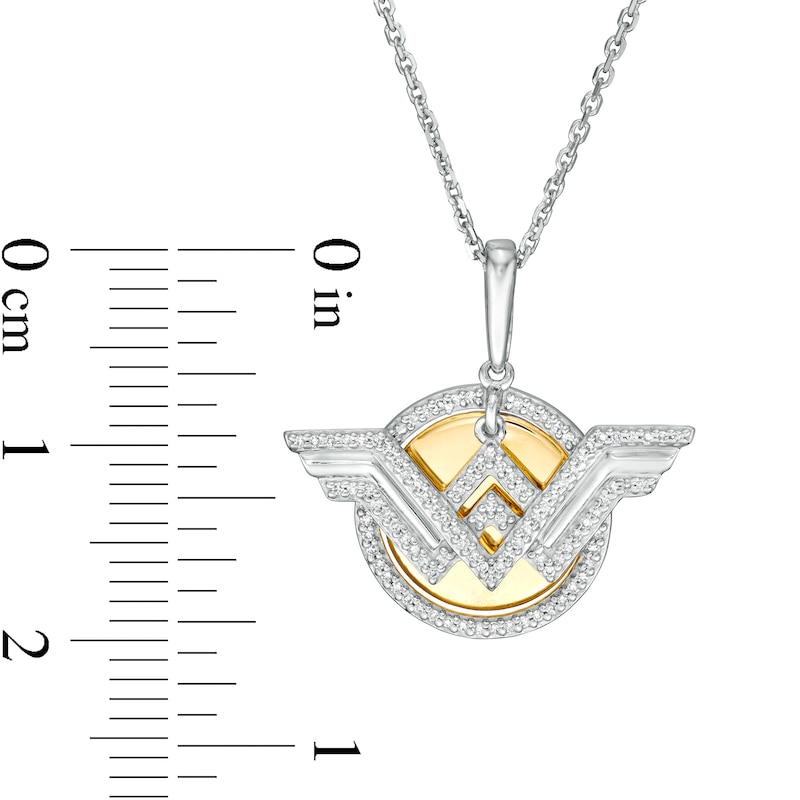 Crafted in sterling silver and 10K gold, this bold design features a silver "WW" logo dangle in polished and diamond-lined detail. In the background, a diamond-lined border surrounds a polished gold disc. Radiant with 1/10 ct. t.w. of diamonds and a brilliant buffed luster, this pendant suspends along an 18.0-inch cable chain, with an additional closure ring at 16.0 inches, that secures with a spring-ring clasp.This exclusive fine jewelry collection inspires you to wear your strength, confidence and power.