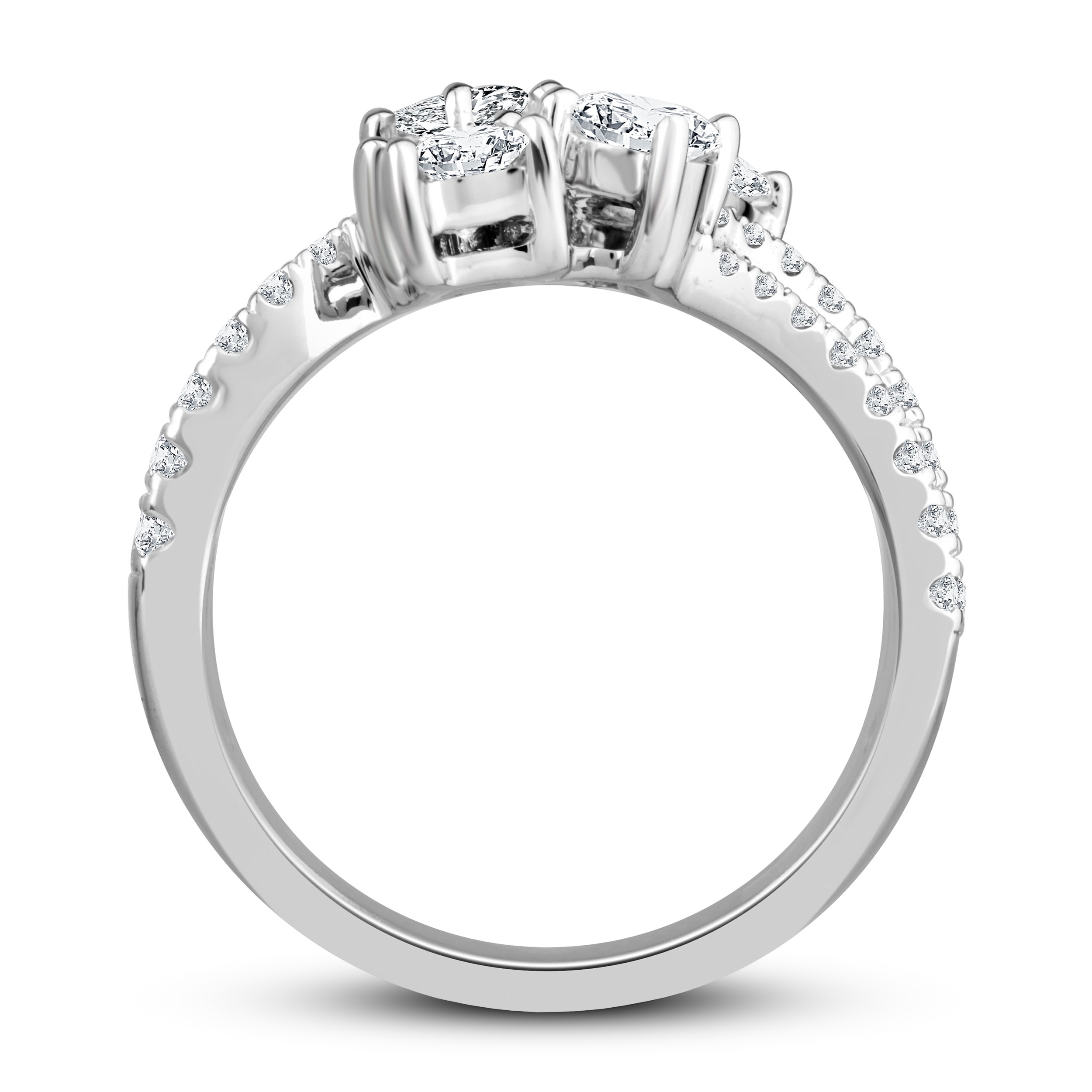This enchanting diamond ring collection features five distinctively-shaped diamonds, symbolic of everything she means to you. Each diamond shape has a different meaning, from integrity and wisdom, to confidence, totality, and elegance. The beautiful 10K white gold ring features an oval-cut, emerald-cut, pear-shaped, round-cut, and princess-cut diamond at the center, while ribbons of brilliant round-cut diamonds flow outward. The gorgeous ring has a total diamond weight of 2 carats.
