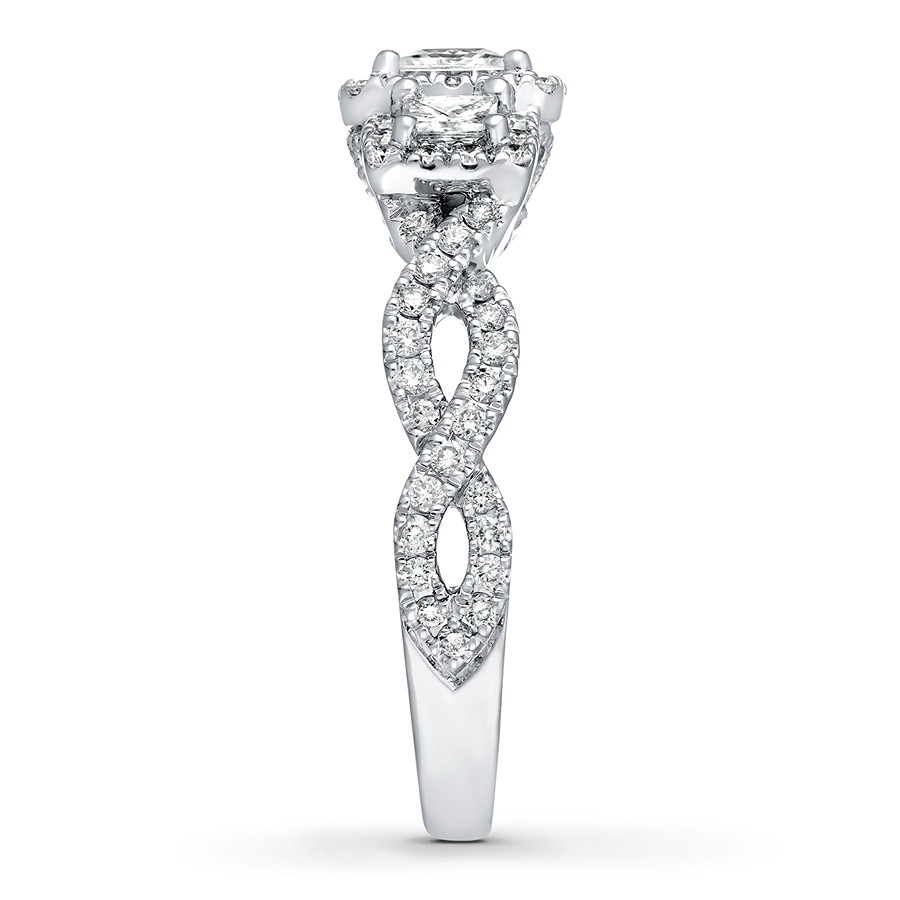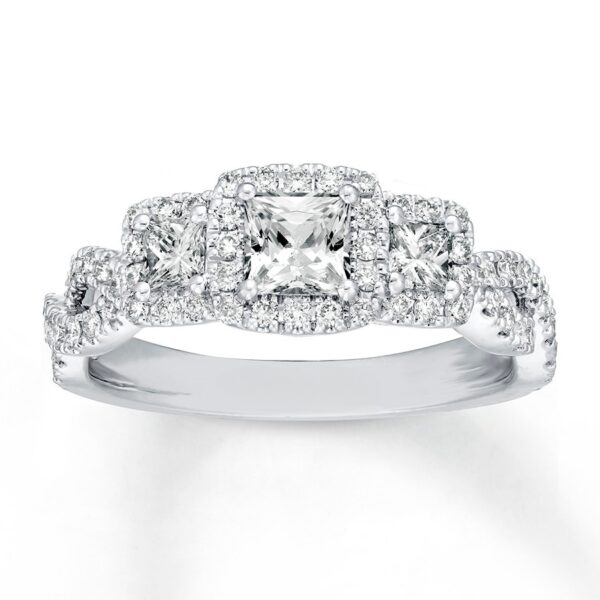 This engagement ring from showcases three dazzling princess-cut diamonds haloed by smaller round diamonds. Twists of diamonds adorn the 14K white gold band, bringing the total diamond weight to 1 1/8 carats.